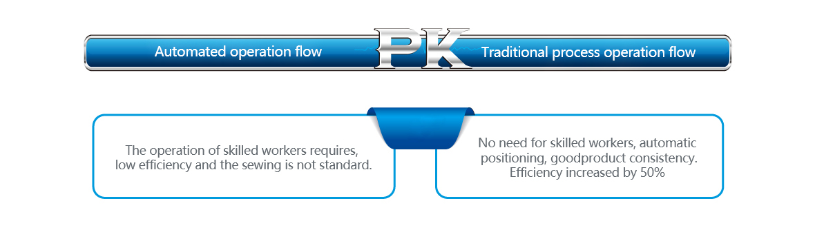 1.Process integration,positioning, feeding, sewing,receiving, all processes are automatically completed on one machine.The operator only needs to put in the cutting piece and press the start button, and the machine automatically completes the sewing of the entire J stitch.